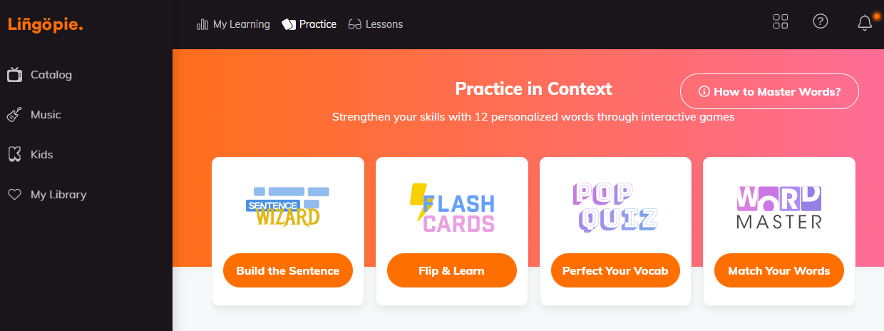 Lingopie's gamified feature can be seen once you go to the review section. For instance, it has Sentence Wizard challenges you to build sentences from the shows you've watched, Pop Quiz tests your comprehension with multiple-choice questions, and Word Master is a matching game for vocabulary practice. All of these games are built from actual dialogue you heard native speakers use, so you're reinforcing real language patterns.