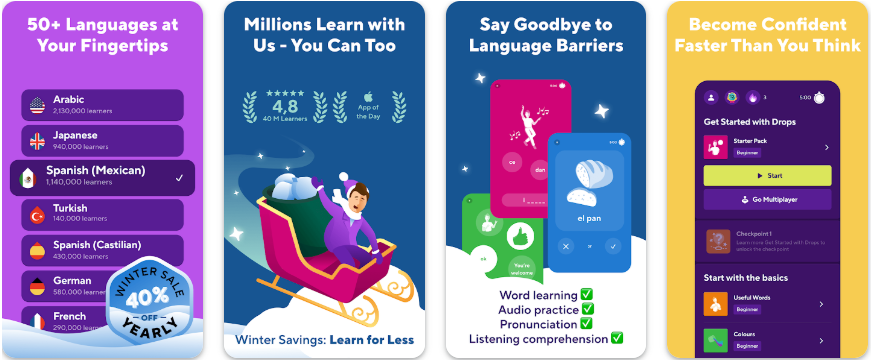 Drops built its reputation on 5-minute lessons that feel like swiping through a beautifully designed game. Every word pairs with a custom illustration, and you learn through fast-paced matching, swiping, and tapping games with zero typing required. The micro-lesson approach eliminates excuses—you always have 5 minutes—and the visual associations significantly enhance memory retention compared to text-based learning.