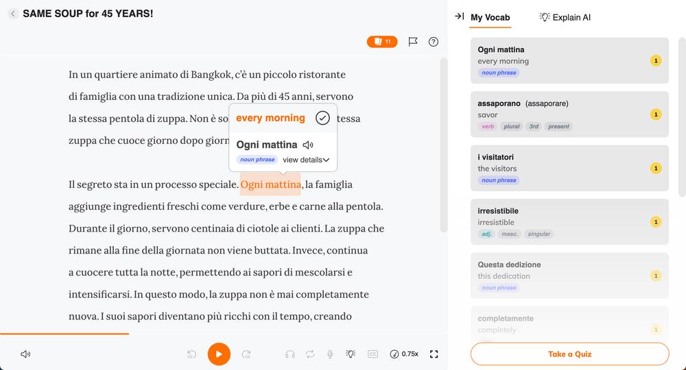 | Interactive stories with audio narration and translations | Focuses on short, story-based content, which keeps lessons easy to fit into your day |