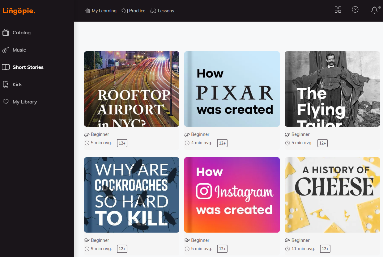 Lingopie Short Stories is designed for adults and teens who want to strengthen their reading skills while learning a new language. It offers short, interactive stories with audio narration, dual subtitles, and instant translations, so you can follow along easily.