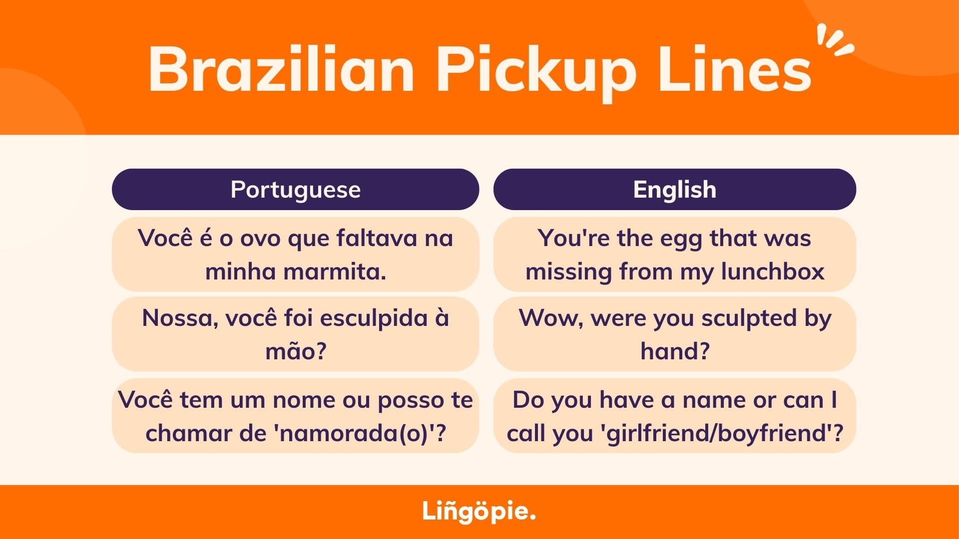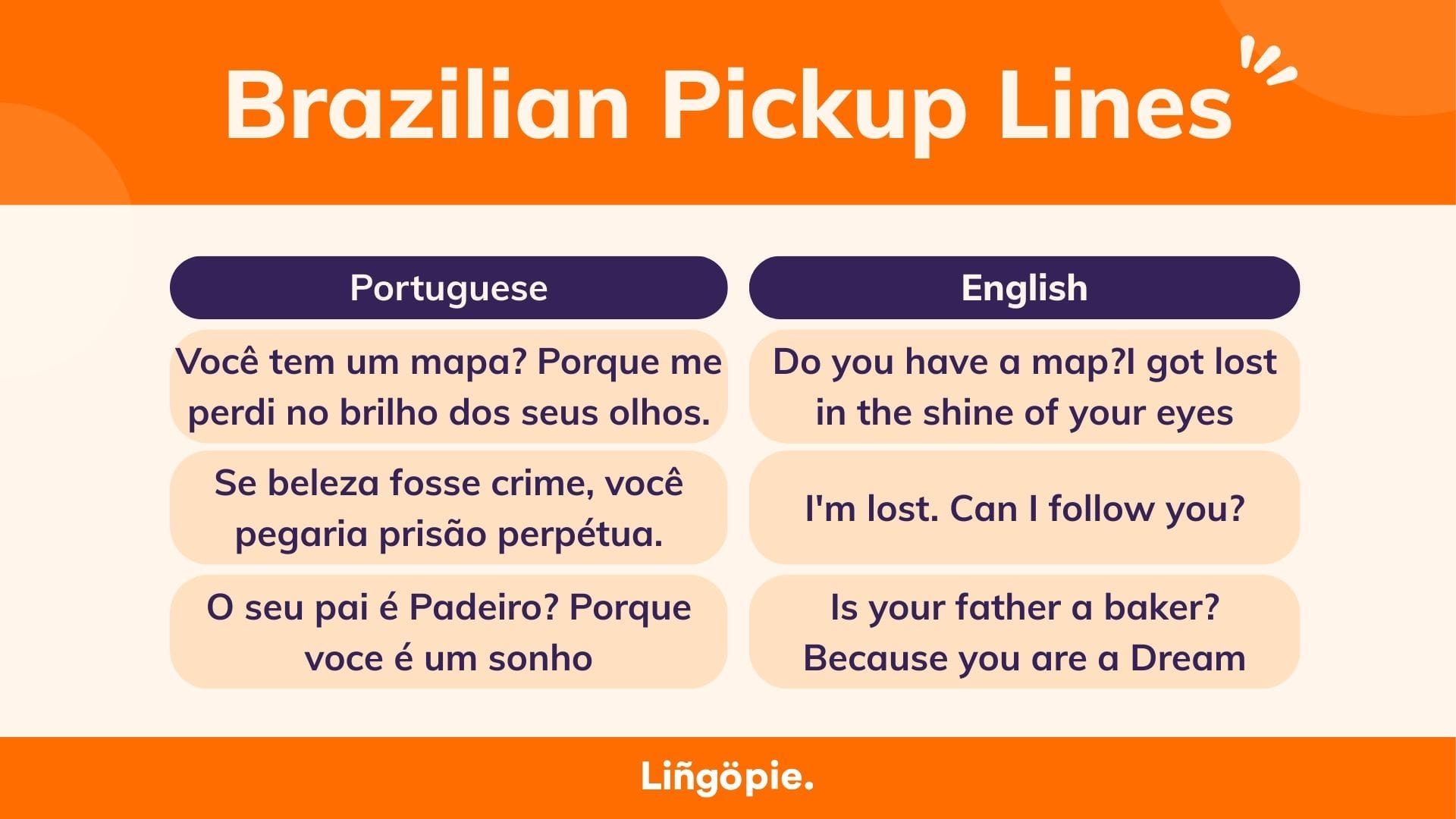 Brazilian Portuguese pickup lines are more than just a way to flirt; they're an expression of the Brazilian spirit—playful, affectionate, and always with a touch of humor. Whether you're looking to charm a new acquaintance or just add some fun to your language learning journey, these phrases are a delightful aspect of Brazilian culture.