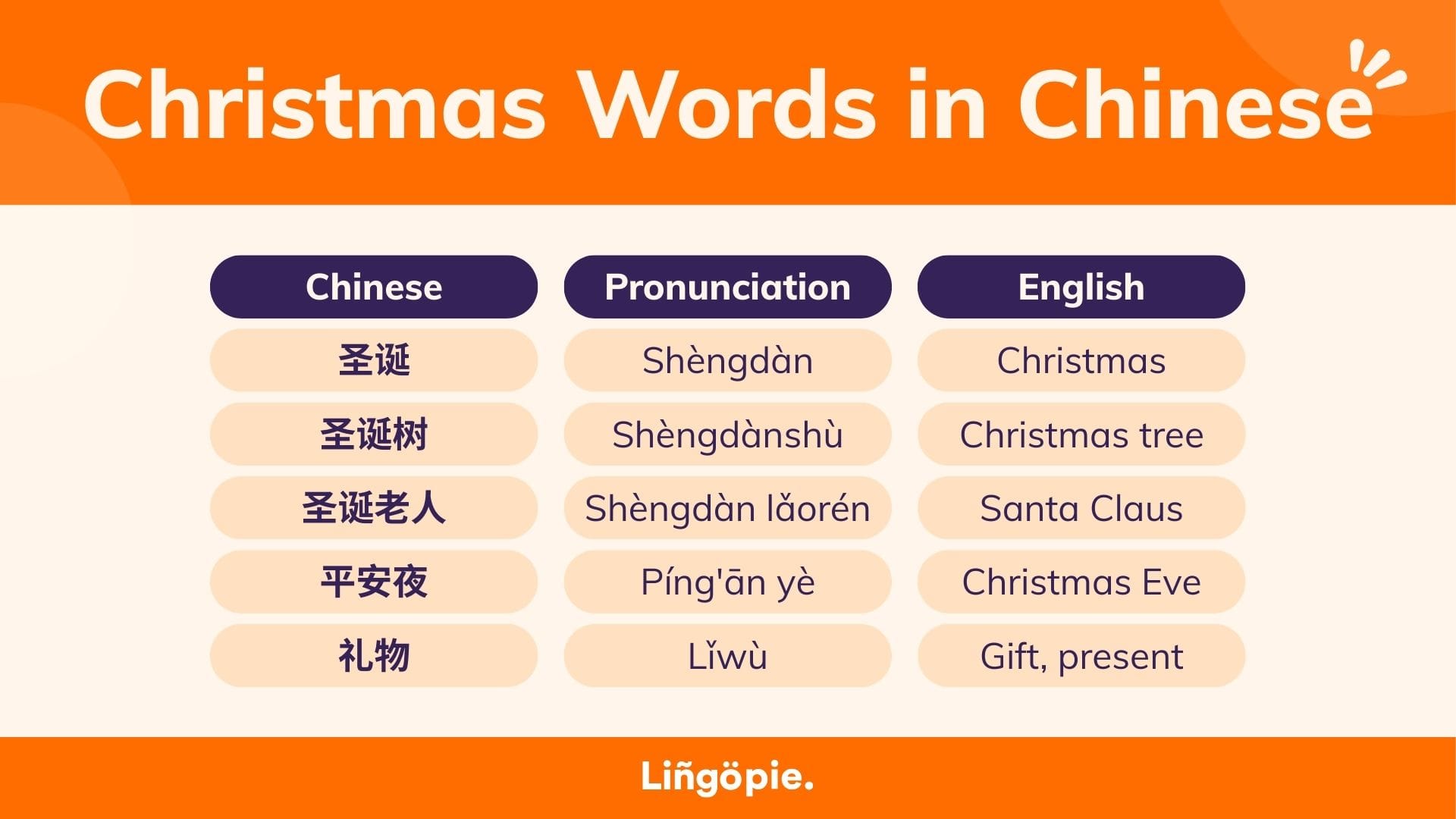 1.Shèngdàn 圣诞 (S) / 聖誕 (T) : Christmas.