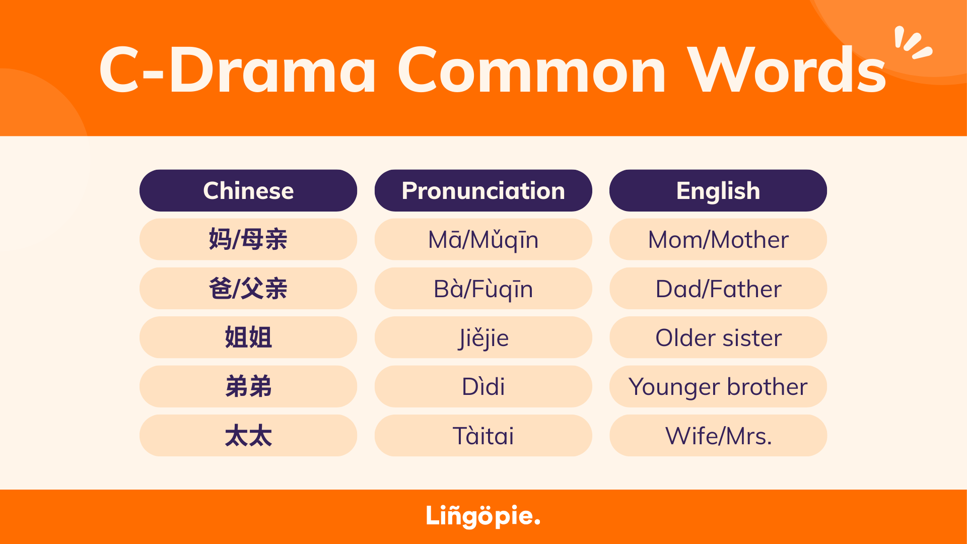 - Tàitai (太太) - "Wife/Mrs." - Especially common in modern dramas