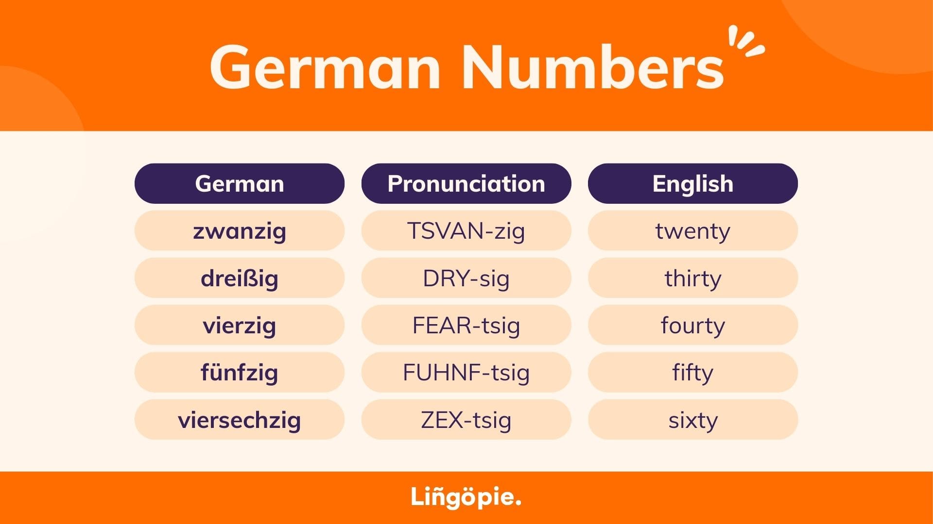 Between forty and ninety, all of these German numbers are regular and follow a sequence of taking the first four letters of the number between 1-10 and adding 'zig.'