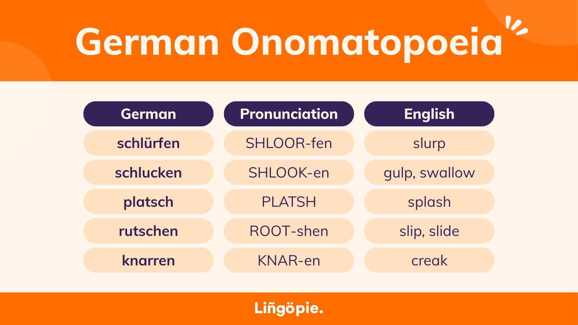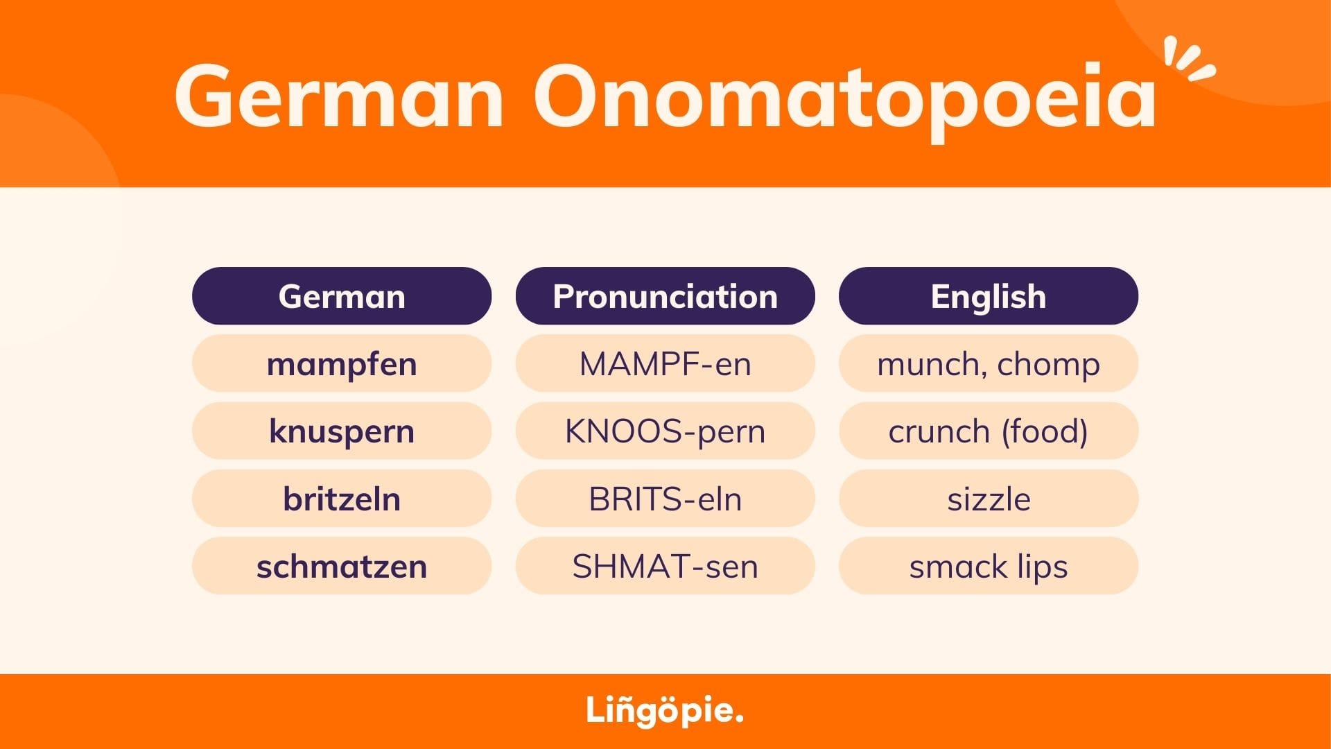 Germans onomatopoeia have specific words for eating and drinking noises. These show up often in casual conversation and food descriptions. Marketing especially loves "knuspern" because it sounds appealing and makes food seem fresh and crunchy.