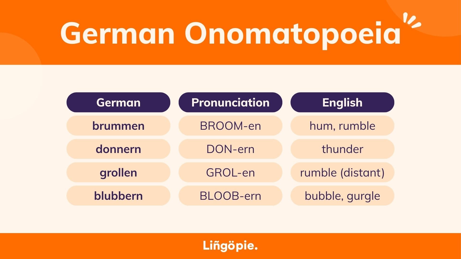 German onomatopoeia uses deep vowels like "u" and "o" for low, rumbling noises. These words often describe engines, thunder, distant sounds, or anything that vibrates or hums. The vowels themselves feel heavy in your mouth when you say them, which matches the sounds they represent.