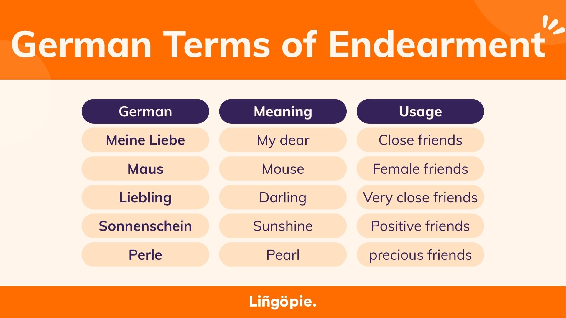 Generally, the German terms of endearment (Koseworte) are affectionate phrases that can be used in various situations, from casual greetings among friends to intimate moments with partners. They're perfect for expressing fondness, showing appreciation, or simply adding a touch of warmth to your everyday conversations.