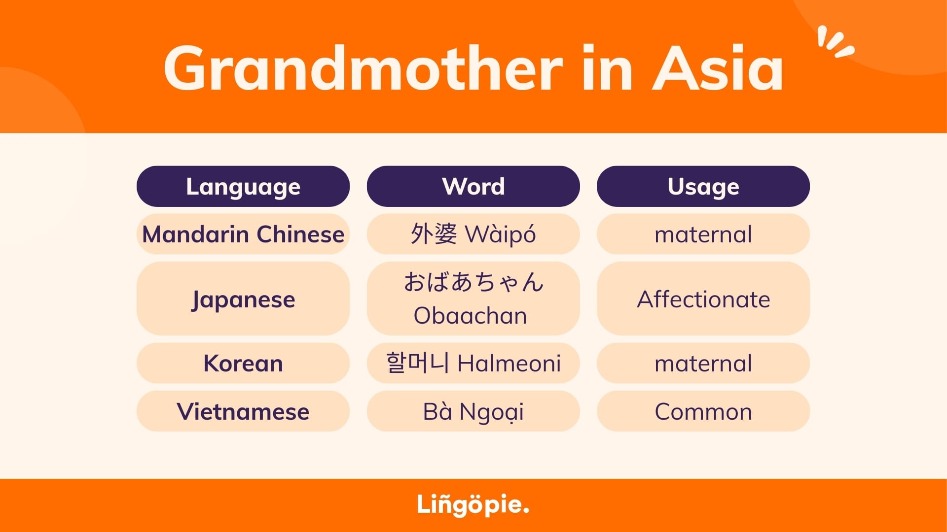 - Korean: 할머니 (Halmeoni), 외할머니 (Oehalmeoni - maternal)