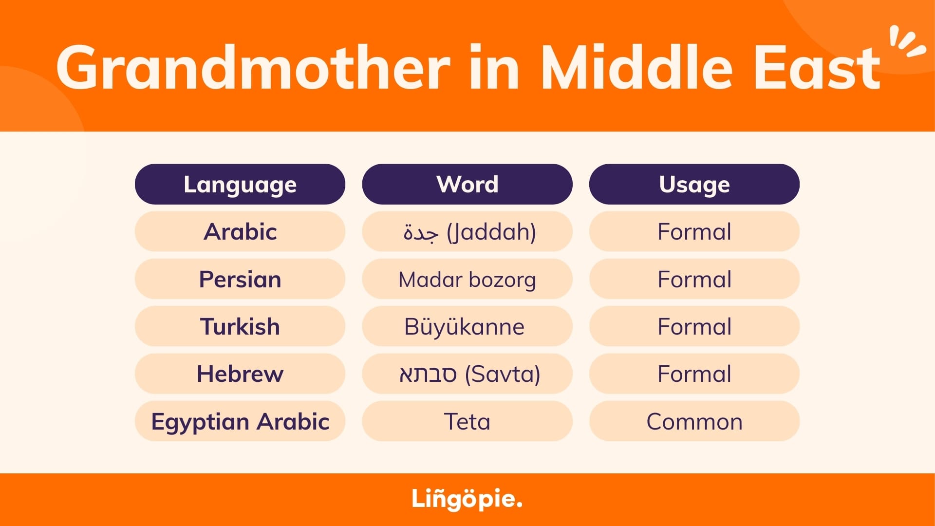 Nobody uses "Jaddah" in daily life – "Teta" rules in most Arab homes, though you'll hear "Sitto" in Lebanon and "Habibti" (my love) added to any variation. Persian families often shorten "Madar bozorg" to just "Maman bozorg" or even "Mamani."