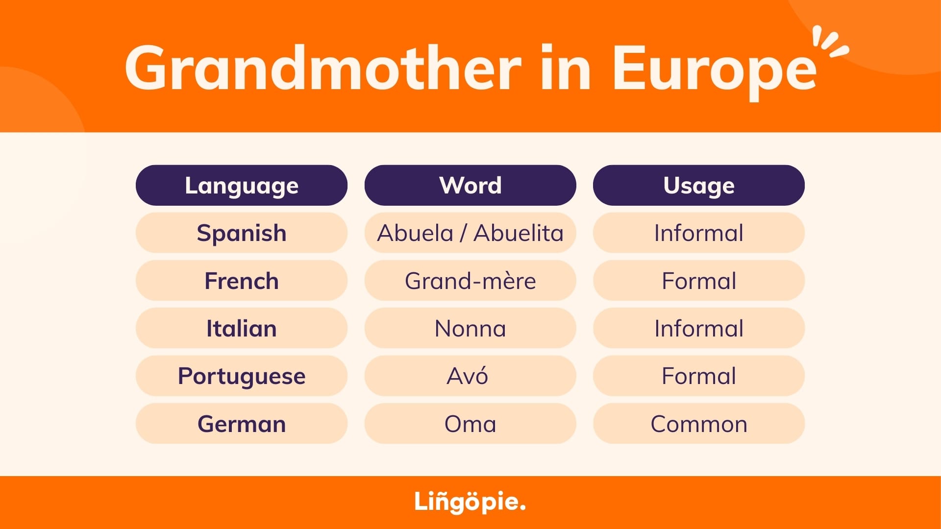 - Spanish: Abuela, Abuelita (affectionate), Yaya (informal)