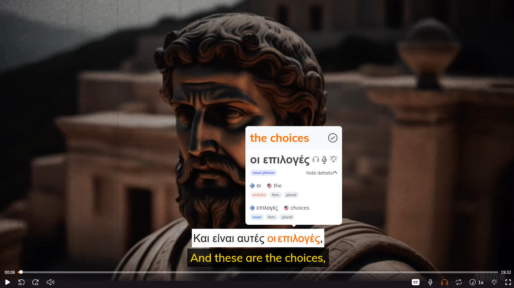 That’s where Lingopie makes learning feel effortless. By watching real Greek TV shows, movies, and podcasts with interactive subtitles, you pick up authentic vocabulary, pronunciation, and cultural context in one go. You can click any word to see its meaning, save it for later, and reinforce it through real dialogue — no flashcards needed.