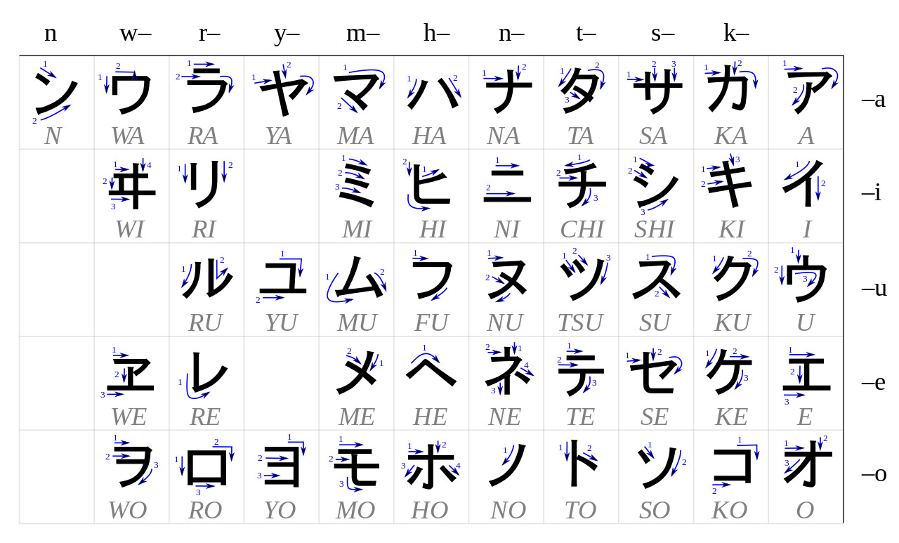 Now assemble your katakana. Katakana is mostly consonant plus vowel blocks, like カ ki ku ke ko for K plus a vowel. You string these blocks together to recreate your sound map.