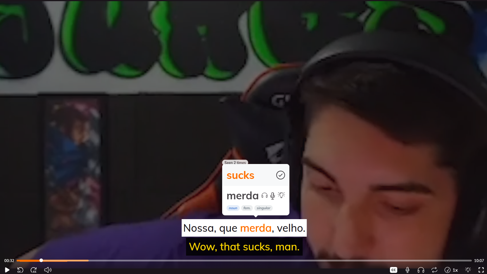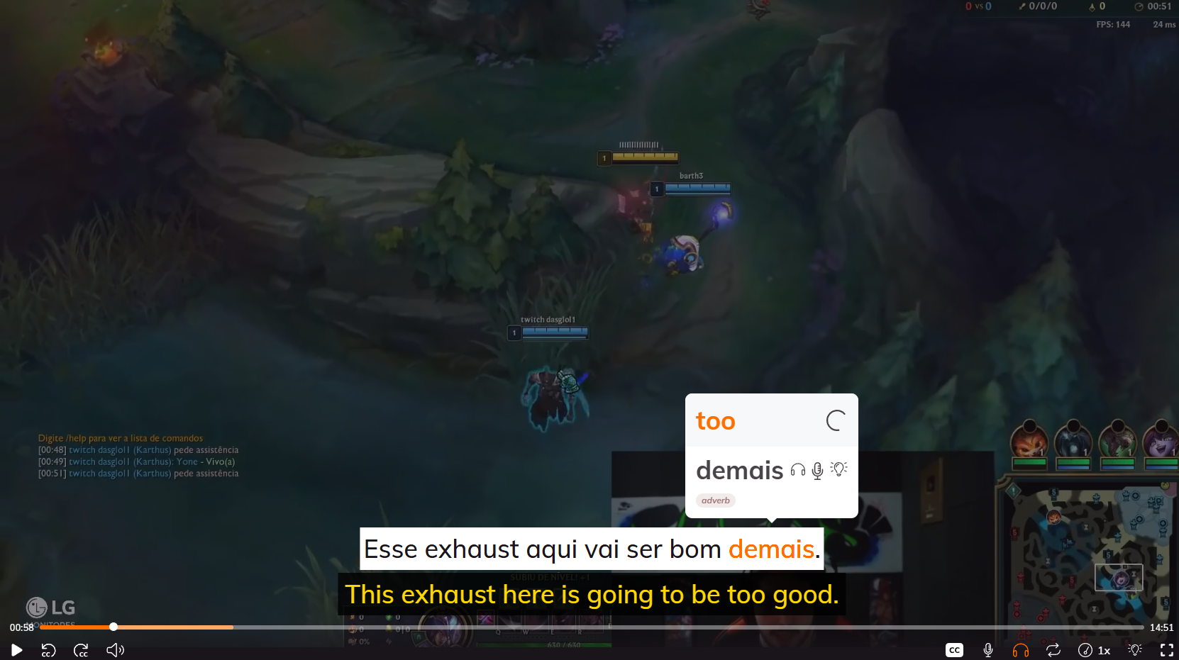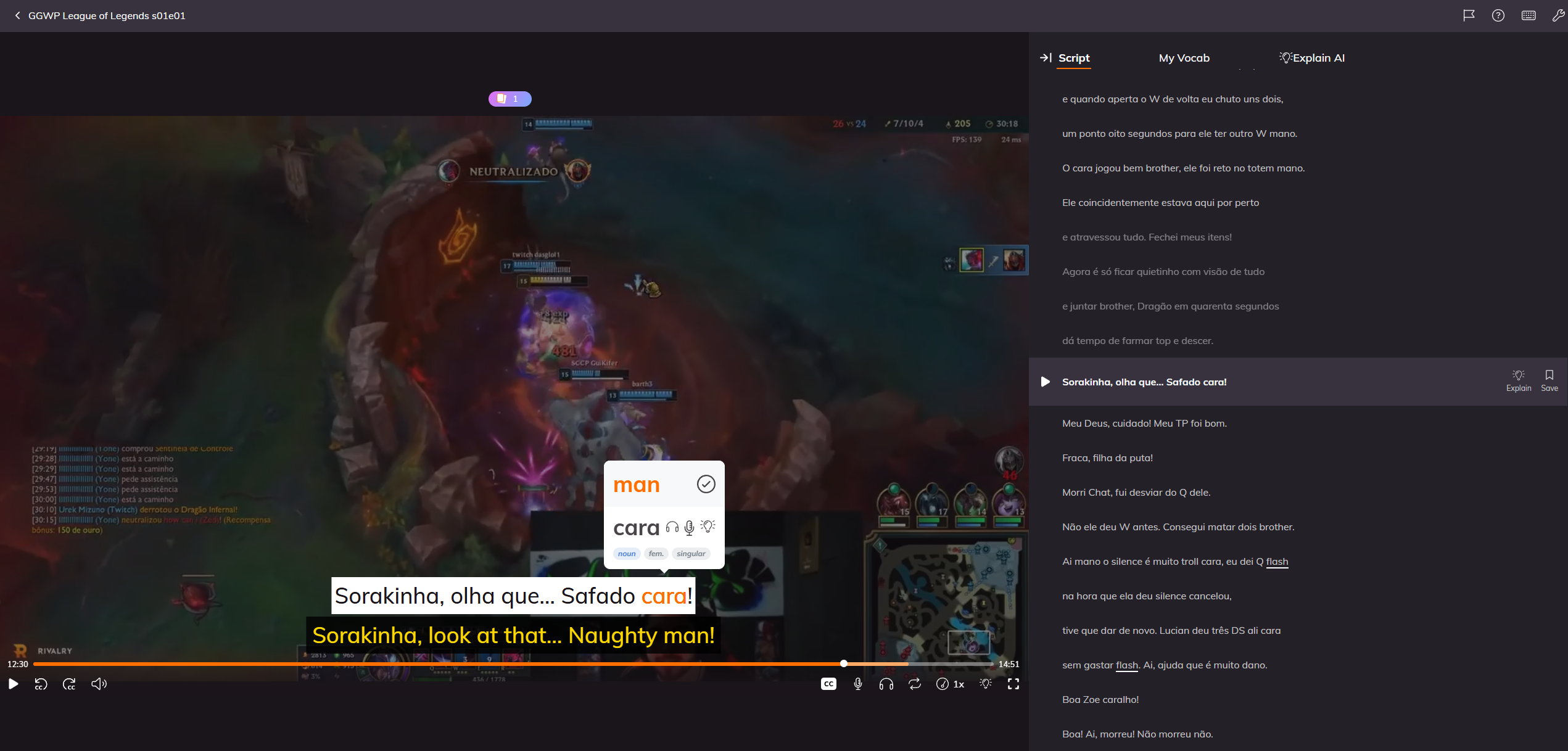 If you're serious about learning Portuguese through League of Legends, Lingopie is the ultimate tool to bridge gaming and language learning. Instead of pausing YouTube videos to look up words or getting flamed in solo queue because you misunderstood a callout, Lingopie lets you watch actual Brazilian pro players from paiN Gaming break down high-level gameplay (entirely in Portuguese) with interactive subtitles that make learning effortless.