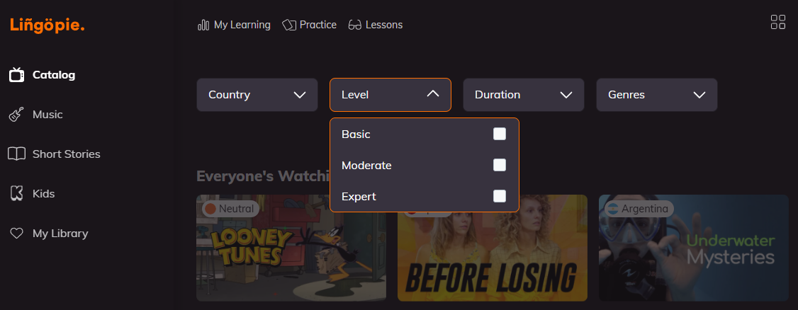 Why Lingopie uses three levels: Our Basic, Moderate, and Expert system simplifies your learning journey. You don't need to worry about whether you're B1 or B2—you know if you're ready for intermediate content or if you should stick with beginner shows for now. As you watch and learn, you'll naturally progress through these levels at your own pace.