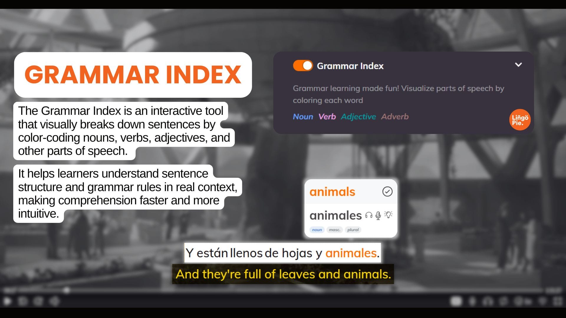 Lingopie created the Grammar Index, a tool that turns any subtitle line into a visual map of the sentence. When you turn on dual subtitles or click a subtitle line, every single word is instantly marked with a color that shows its role. It’s a simple way to see the full structure of the sentence without pausing or digging through grammar explanations.