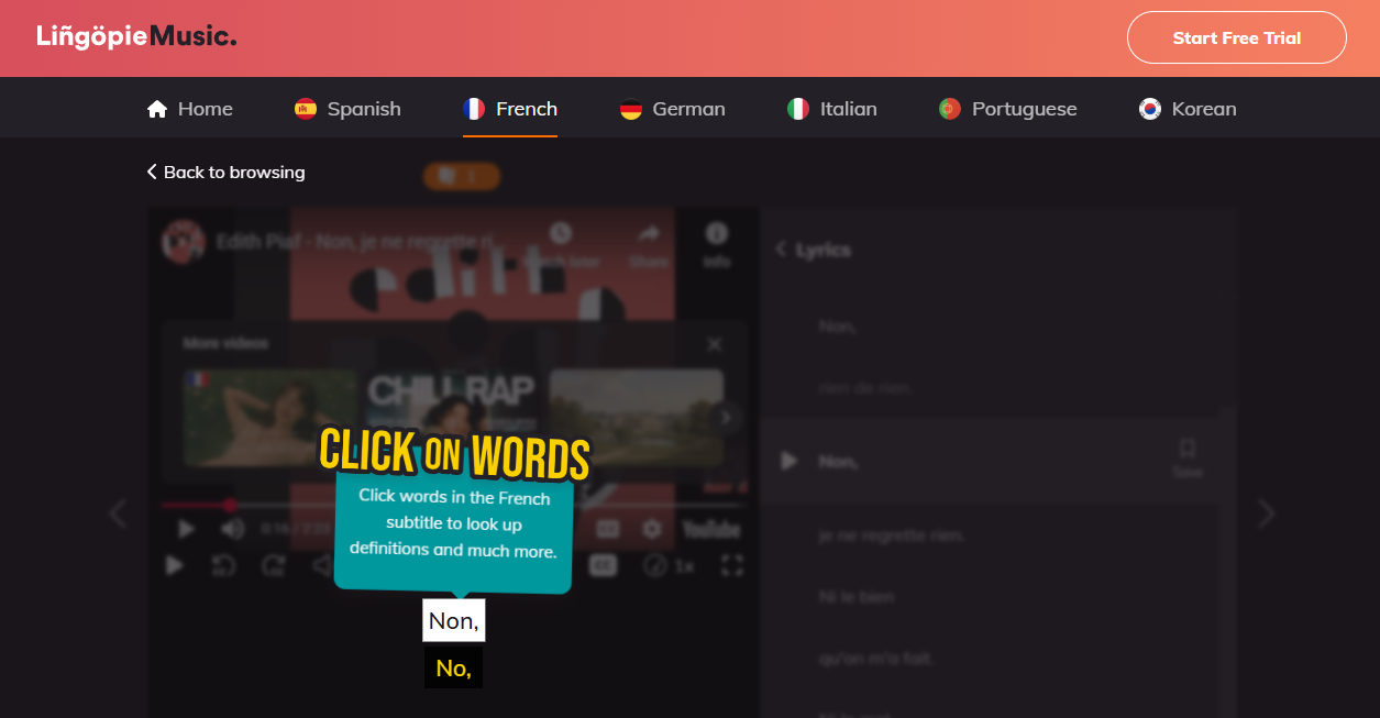 For the next step, I encourage you to pick one song in your target language on Lingopie Music (included with your Lingopie subscription for selected languages). Use the dual subtitles. Click on words you do not know. Let the song loop until it gets stuck in your head. You will be singing in another language without realizing you learned it.