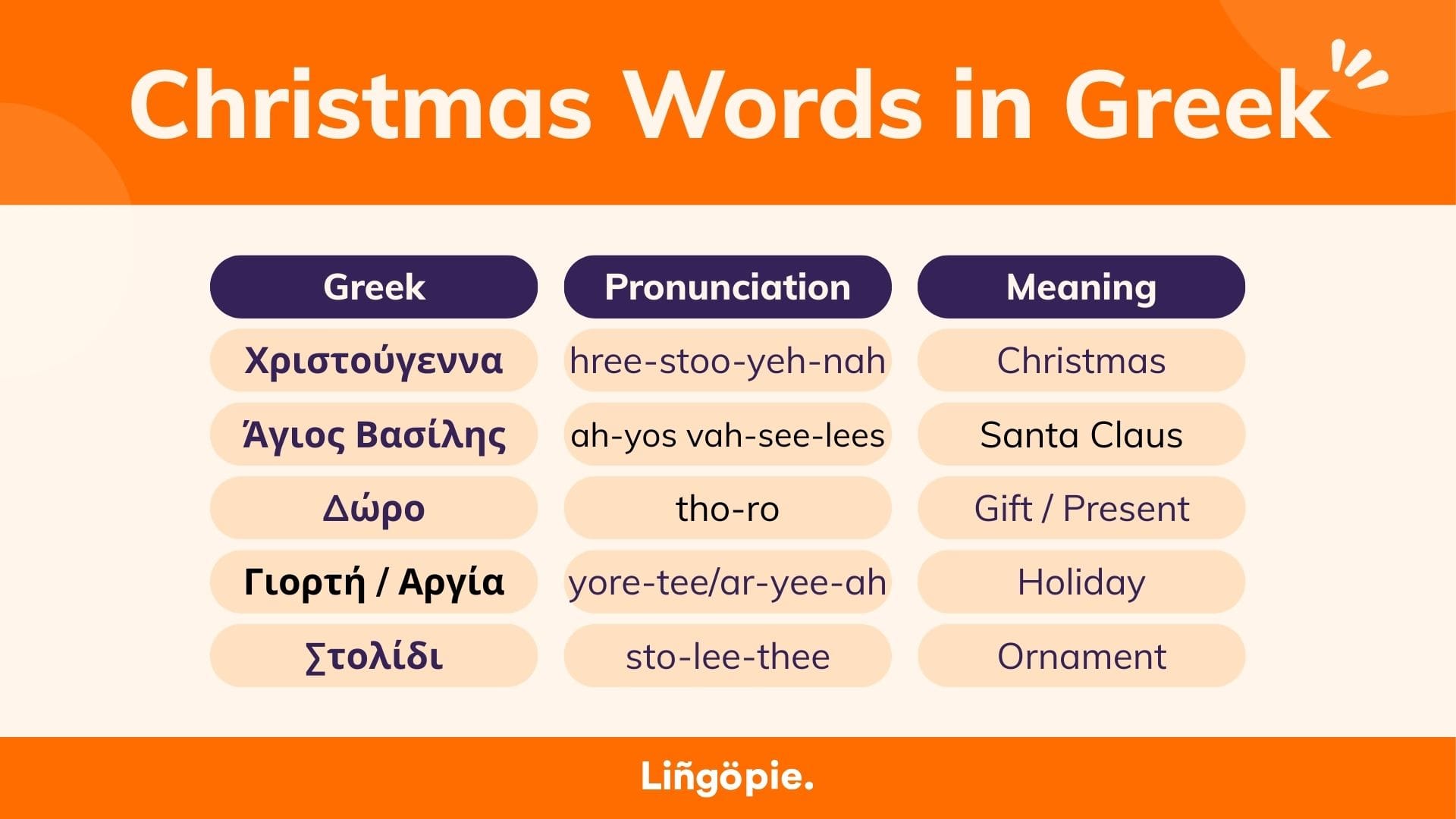 | Christmas | Χριστούγεννα | hree-STOO-yeh-nah |