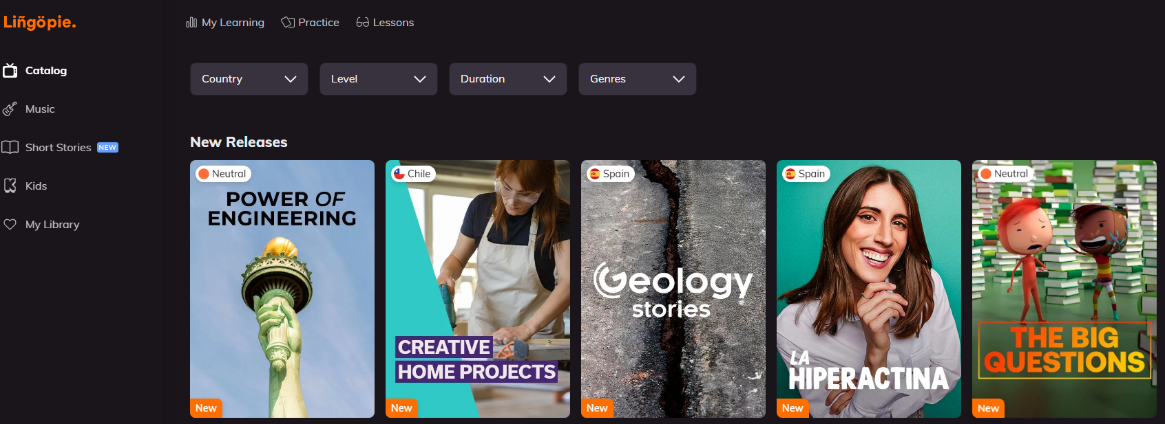- Curated Catalog: Choose from shows, movies, and documentaries selected specifically for learners, at different levels and genres.