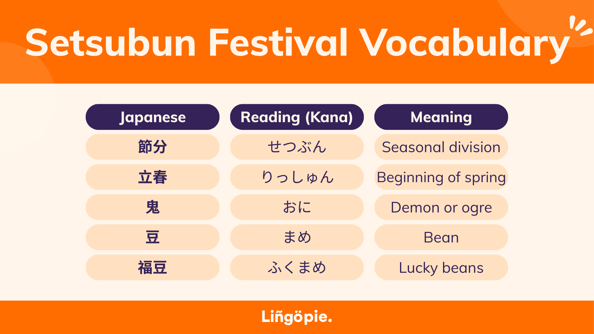 The Setsubun Festival in Japan introduces seasonal words, everyday nouns, and cultural phrases that appear in conversations, commercials, Japanese anime episodes, and variety shows every February. Many of these terms are short and highly repeatable, which makes them perfect for learners.