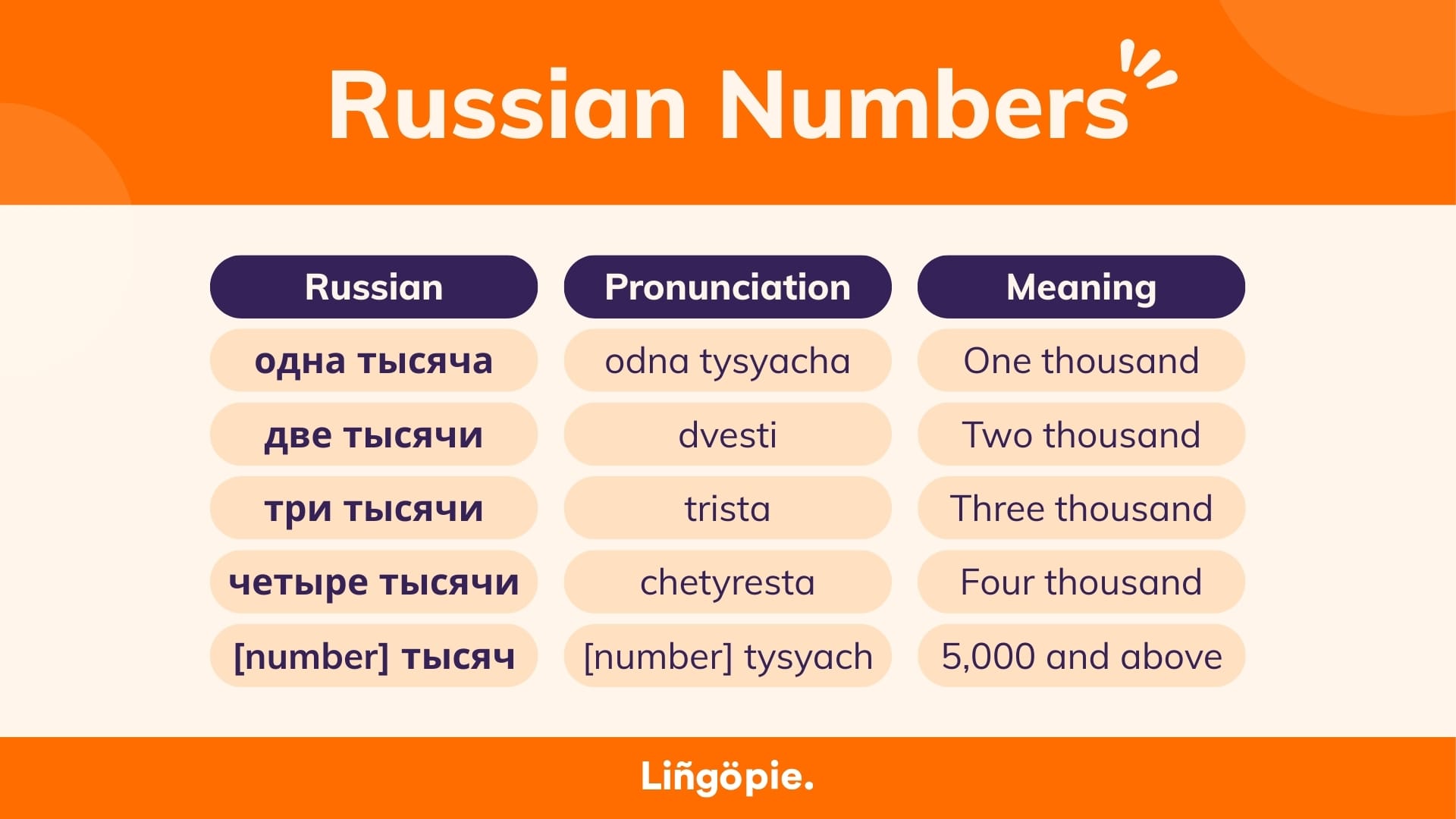 Keep practicing, and soon you'll be counting large numbers in Russian with ease! Try creating simple sentences using these numbers to reinforce your learning.